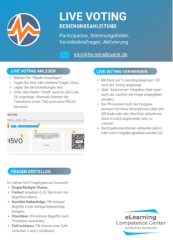 Das ILIAS-Objekt "LiveVoting" ist ein in ILIAS integriertes "Audience Response System". Das LiveVoting kann innerhalb von Präsenveranstaltungen genutzt werden, um mehr Interaktivität zwischen den Lehrenden und Teilnehmenden/Studierenden zu ermöglichen. Sie können mit dem LiveVoting beispielsweise Fragen stellen, ein Stimmungsbild abfragen oder auch Ideen in Form von kurzen Texten sammeln.