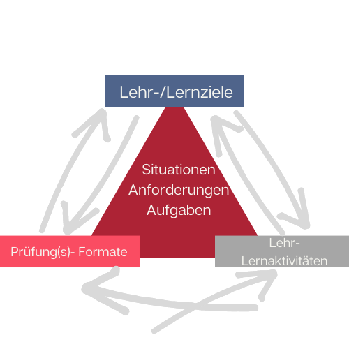 Hier wird das Modell des "Constructive Alignment" vorgestellt. Das Modell verdeutlicht, dass Zielformulierungen, Auswahl von Inhalten und die Prüfungsformen notwendigerweise aufeinander abgestimmt sein müssen.