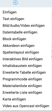 Über den Punkt "Materialienliste einfügen" können Sie Lernobjekte innerhalb der Seitengestaltung platzieren. Dies funktioniert auf der Kursstartseite oder in einem Ordner.