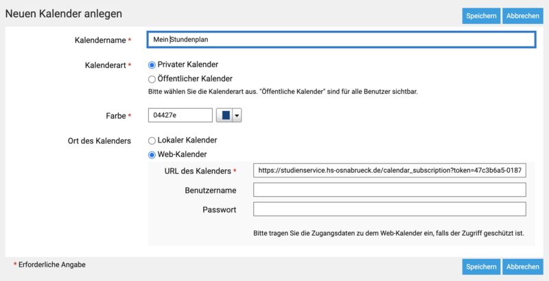 Um nun den exportierten Stundenplan in ILIAS einzufügen, gehen Sie in Ihrem Kalender auf "Kalender verwalten" und legen Sie einen neuen Kalender an. Vergeben Sie einen aussagekräftigen Namen und wählen Sie nach Bedarf eine andere Anzeigefarbe für Ihre Termine aus. Wählen Sie anschließend den Punkt "Web-Kalender" aus und fügen Sie hier den kopierten Link ein - ein Benutzername und Passwort wird nicht benötigt.
